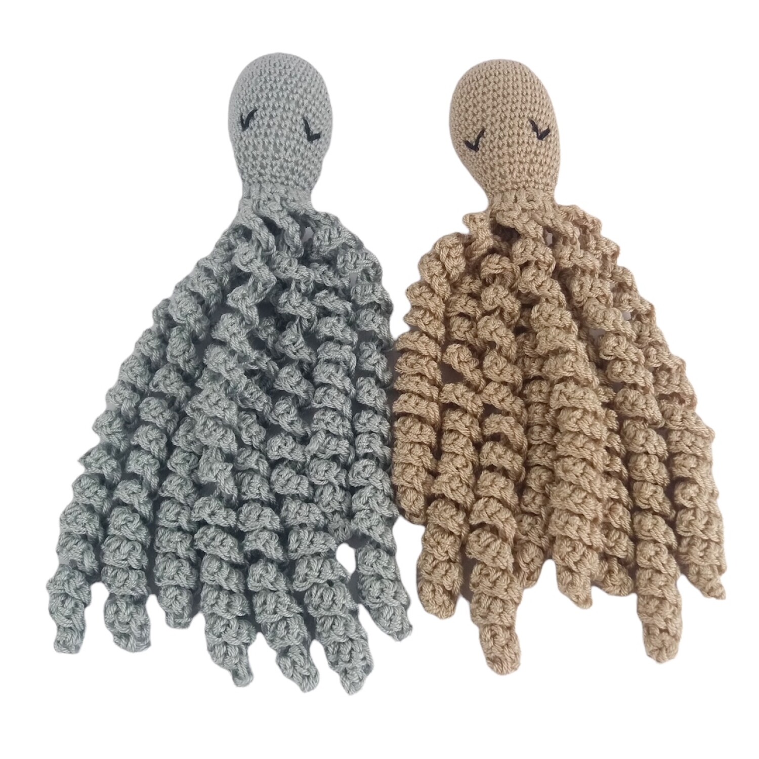 Destacamos en este ajuar el pulpo de crochet, que se entrelaza en las pequeñas manos del bebé porque, según los expertos, se consiguen grandes logros en el desarrollo del recién nacido.