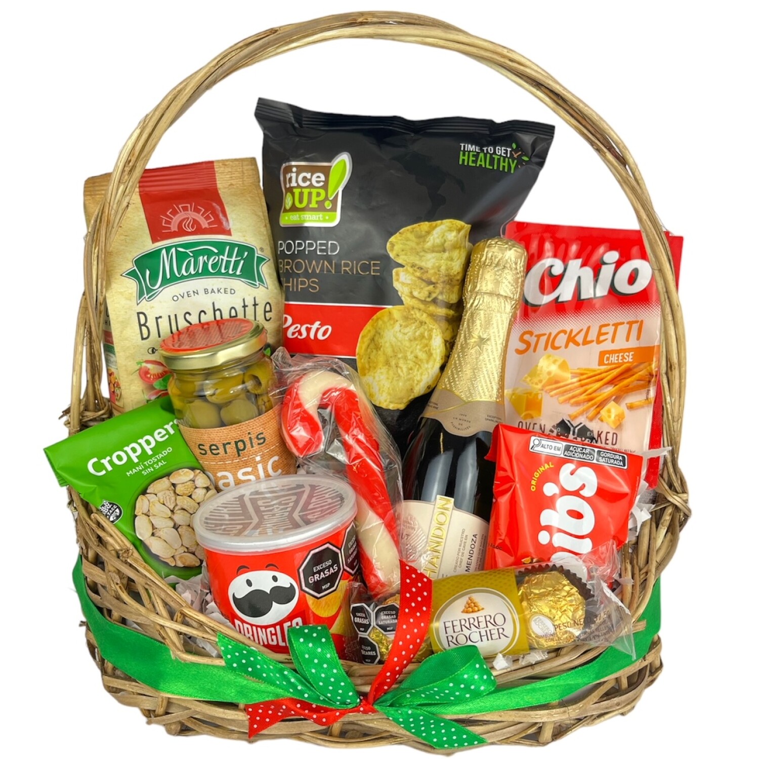 Presentado en canasta artesanal de mimbre , envuelta en celofán, con moña y tarjeta con mensaje personalizado
