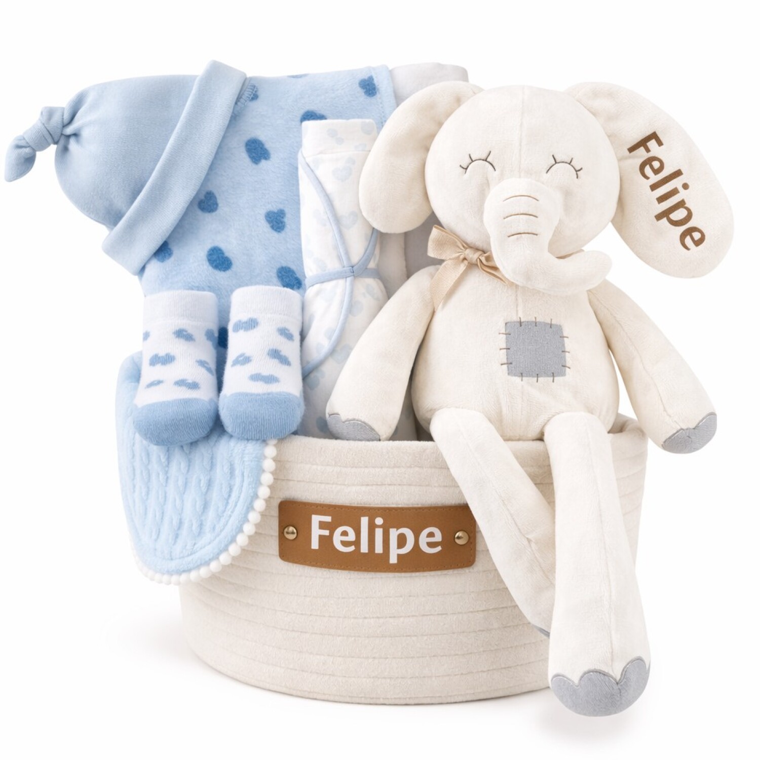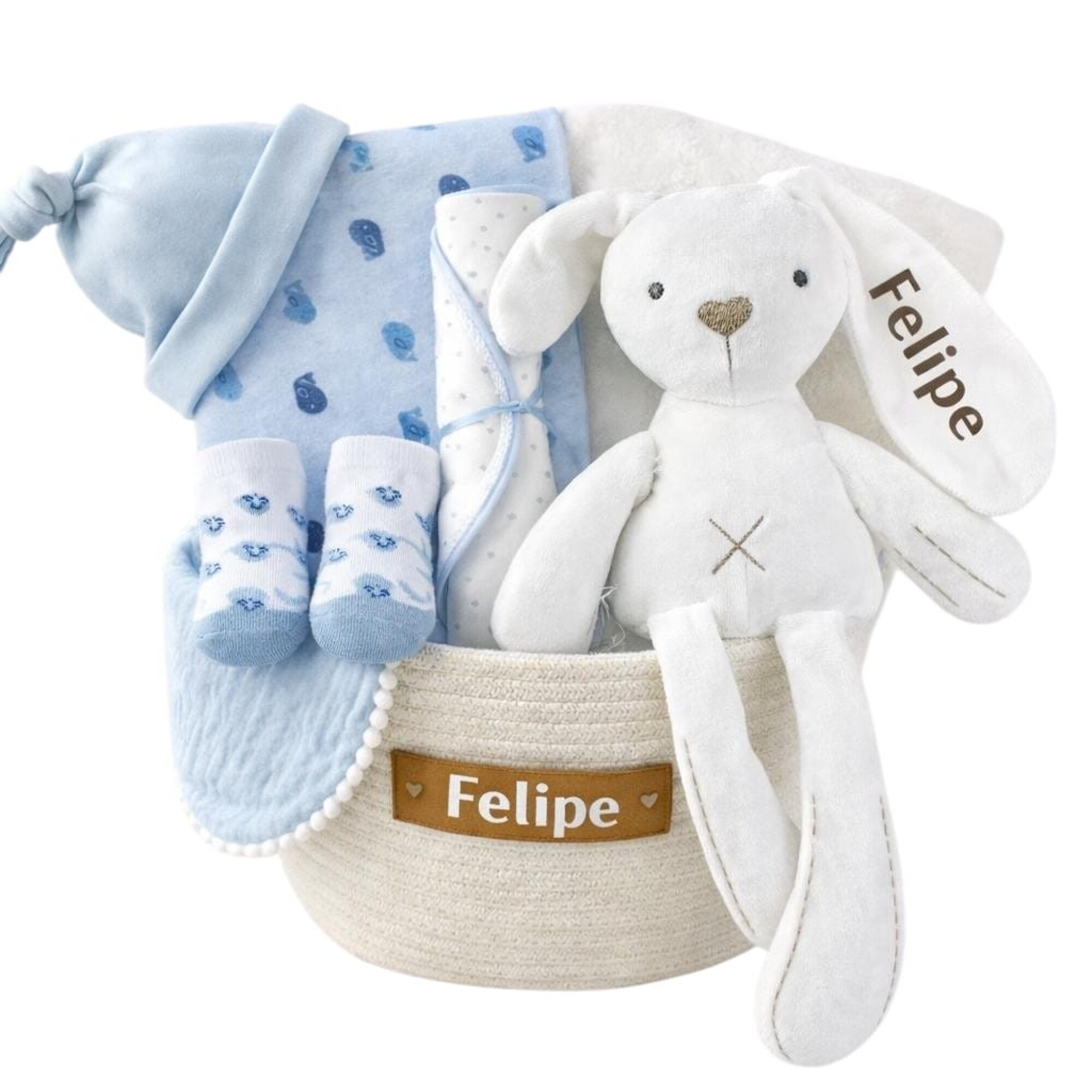 - Peluche suave, personalizado con el nombre del bebé (conejo o elefante según stock)