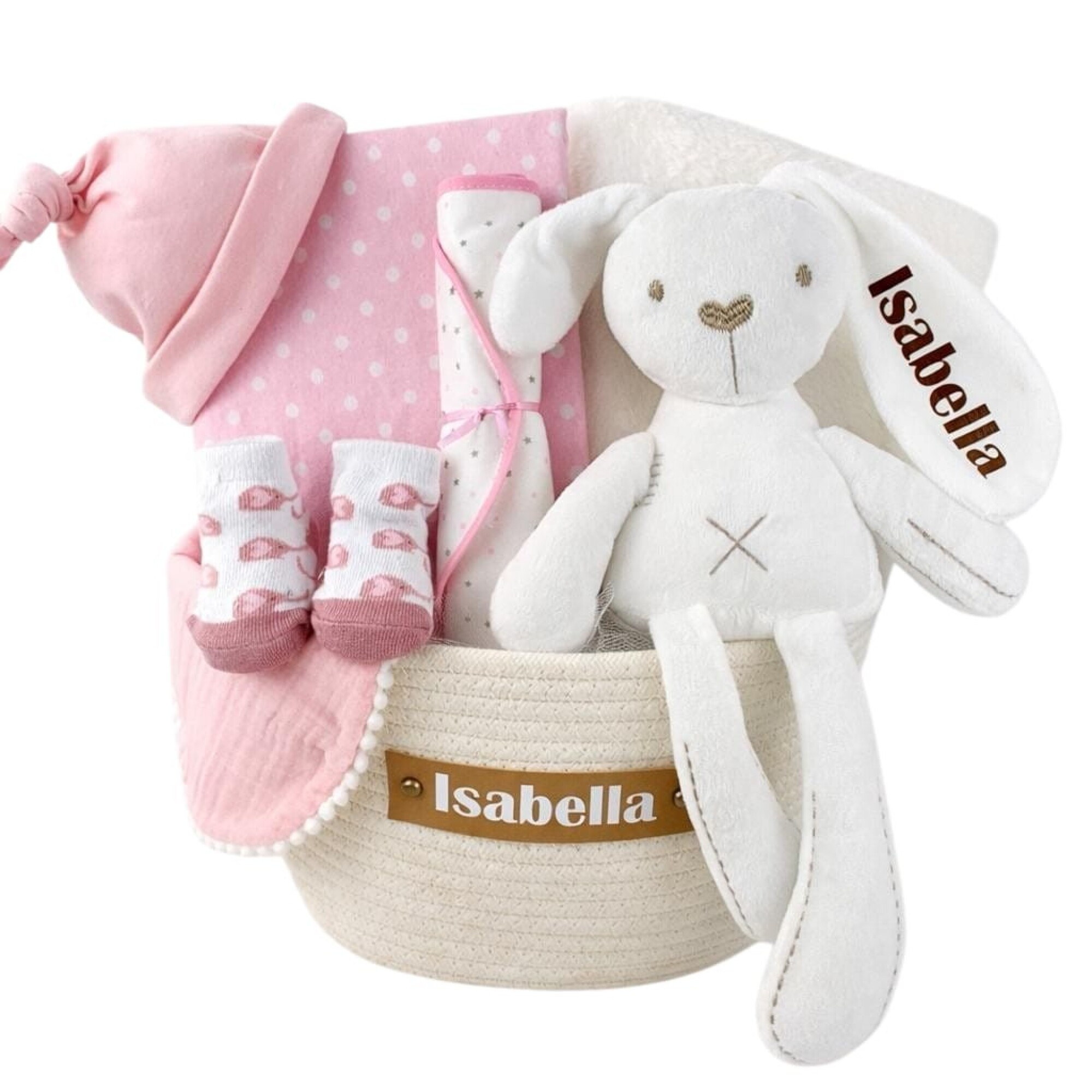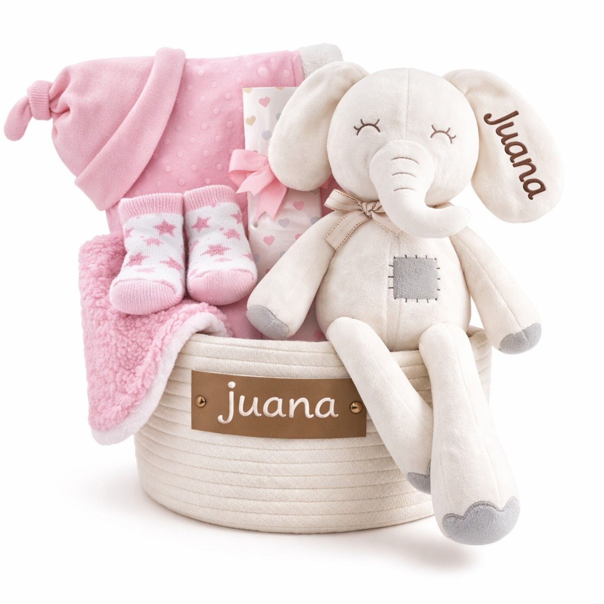 • Peluche suave, personalizado con el nombre del bebé (conejo o elefante según stock)