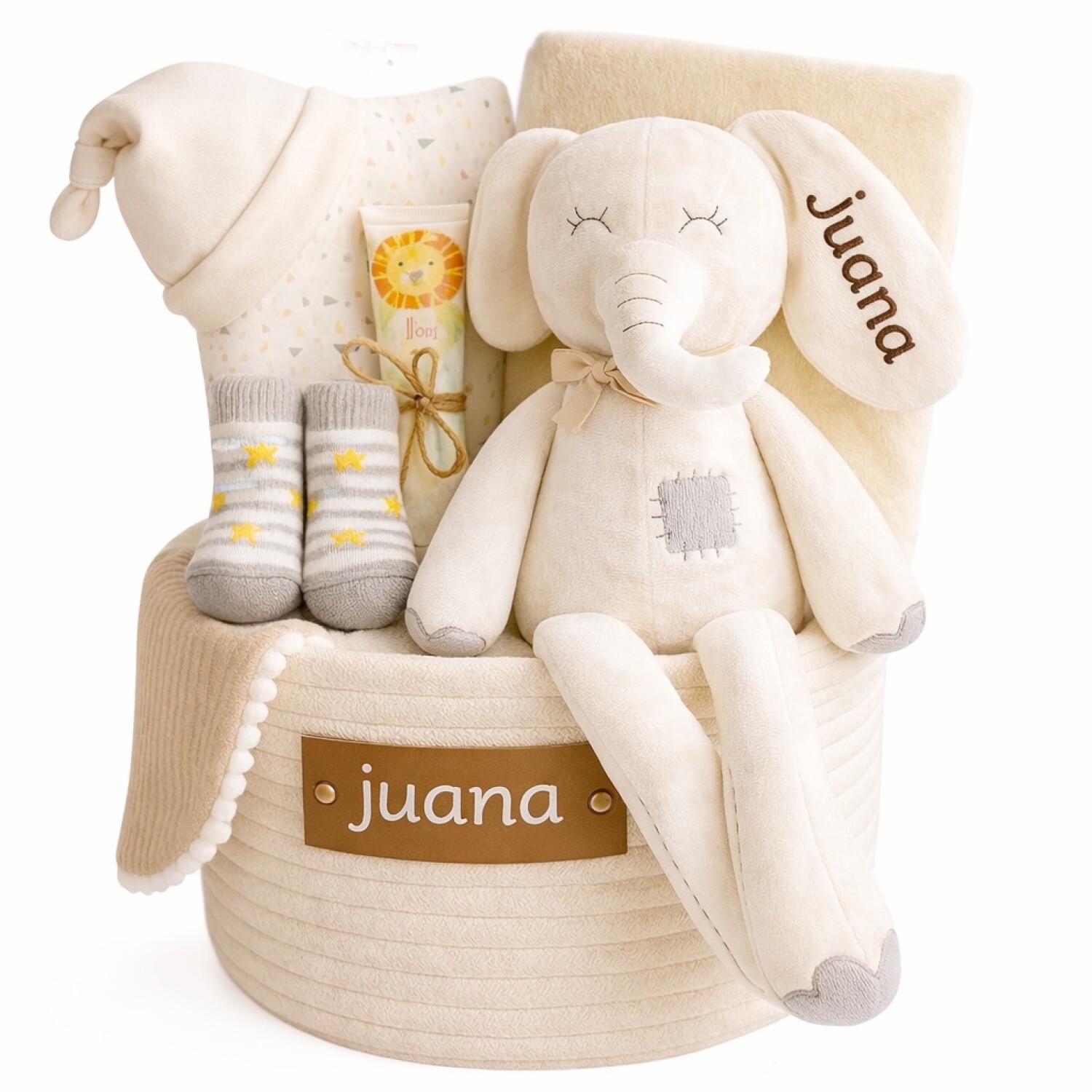 - Peluche suave, personalizado con el nombre del bebé (conejo o elefante según stock)