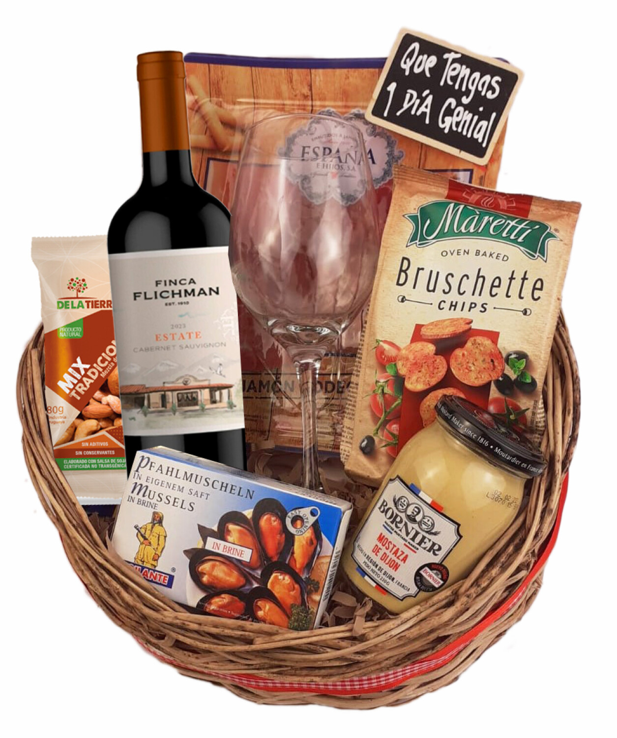 Hermosa canasta estilo gourmet que bautizamos copetín español por su característico jamón acompañado de vino.