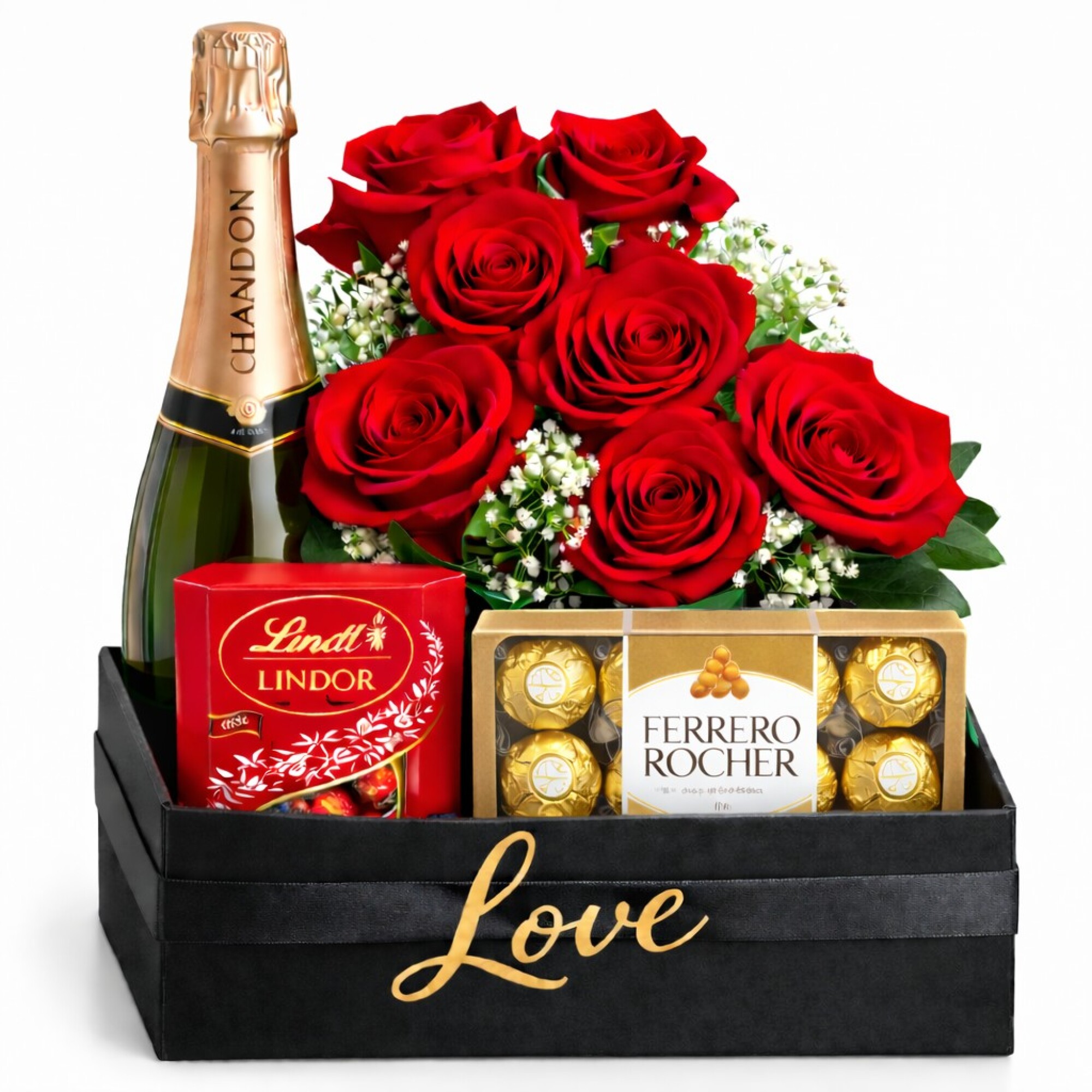 Este exclusivo arreglo reúne rosas rojas naturales, símbolo universal del amor, junto a chocolates de primeras marcas y una botella de espumante Chandon para brindar por los momentos más importantes. Todo presentado en una box premium con cinta, logrando un regalo sofisticado, moderno y listo para sorprender desde el primer momento.