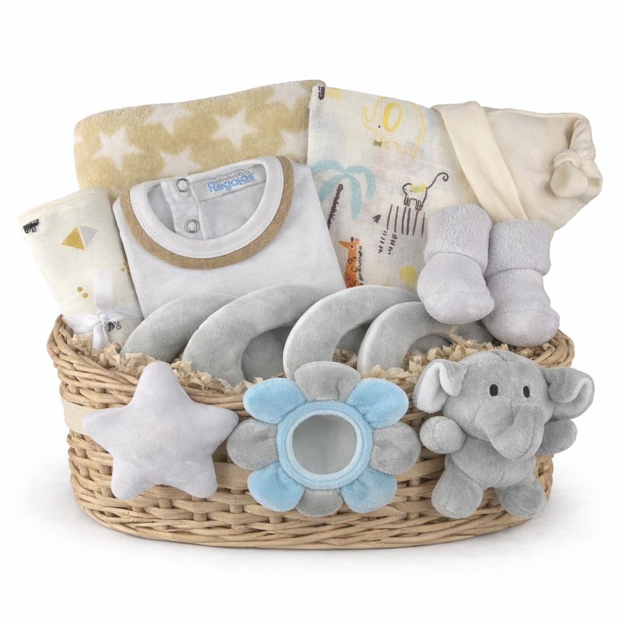 De esta canasta de nacimiento nos fascina el colgante para carro del bebé o en la cuna.